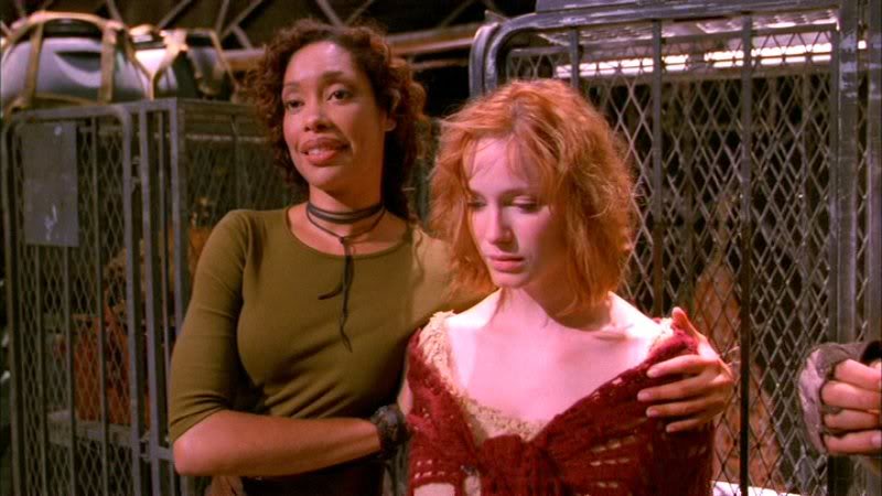To FBI agent Paul Ballard, Mellie is literally the Girl Next Door. She appears sensual rather than glamorous, exuding warmth rather than a beauty built upon exclusion and coldness. In the absurd world of TV standards, Mellie can be considered “TV fat.”[8] However, one should take this appellation with a massive grain of salt. Remember, we live in a world where the media describes Jennifer Love Hewitt as “voluptuous.”[9] Saffron (Christina Hendricks) from Firefly represents a truer example of the voluptuous female, with the character combining deception with a fleshly sensuality.