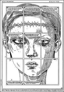 Throughout the book, Panter maintains a rigid almost mannerist division of panels. On some pages, the narrative moves forward. On others, the panels split up a massive picture. The division of images and architectural design harkens back to another monument of Christian doctrine, the Sistine Chapel, itself an innovative amalgamation of Christian and Greco-Roman classical imagery.