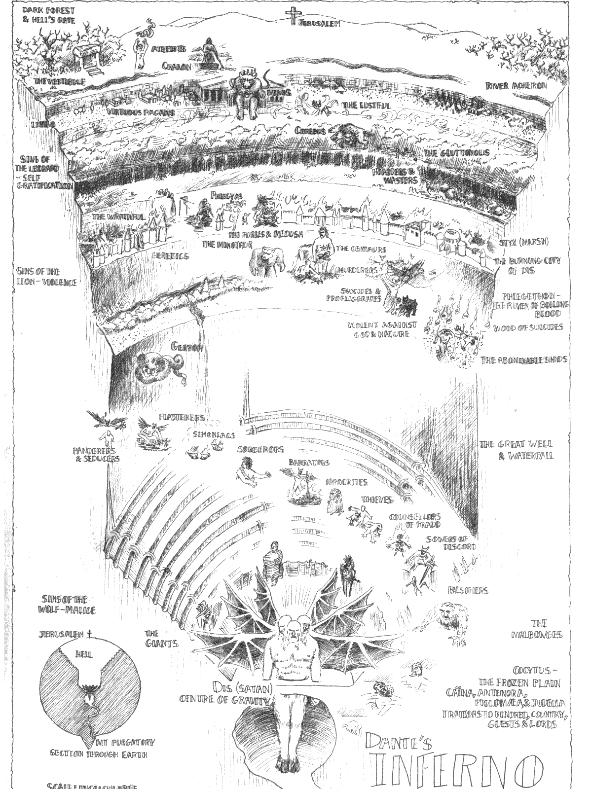 The representation of Hell as a cartographic region has its origins in Dante’s Divine Comedy. Dante adapted the imagery already present in medieval painting and sculpture to comment on his political situation and his own scientific and theological beliefs. He populated it with real people, including political heroes and villains, good popes and bad popes, adulterous princesses, and monsters human and mythological. On Dante’s spiritual journey, he traveled with the Roman poet Vergil down the various circles of Hell and then up Mount Purgatory. Finally, led by his beloved Beatrice, he journeyed through the heavenly spheres until he was in the presence of God.